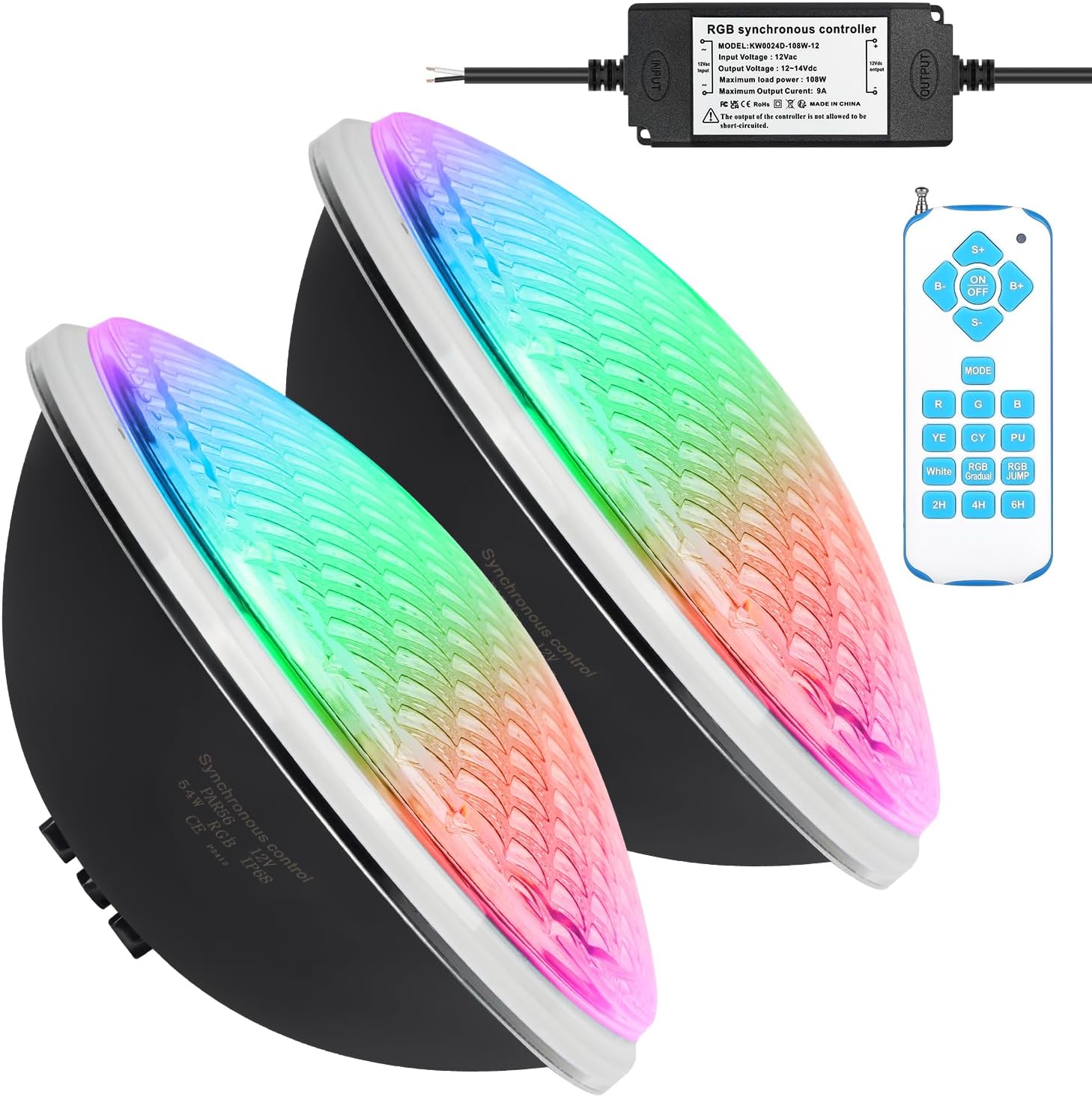 KWODE 54W LED Poolbeleuchtung PAR56, 12V RGB Timing 2/4/6H Schwimmbadbeleuchtung, Externe Synchronisation mit Fernbedienung, IP68 Wasserdichter Pool Lampe Licht mit Fernbedienung (2 Stück)