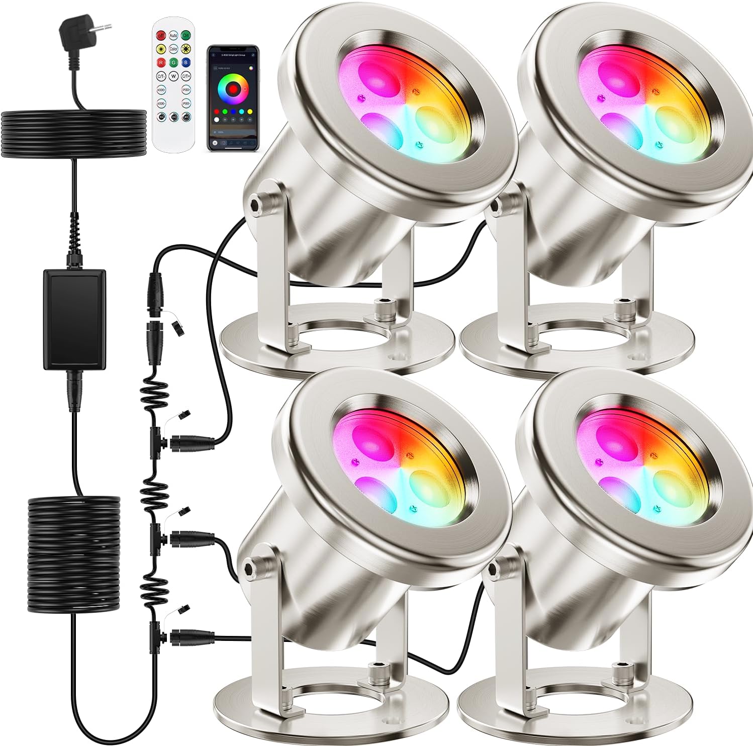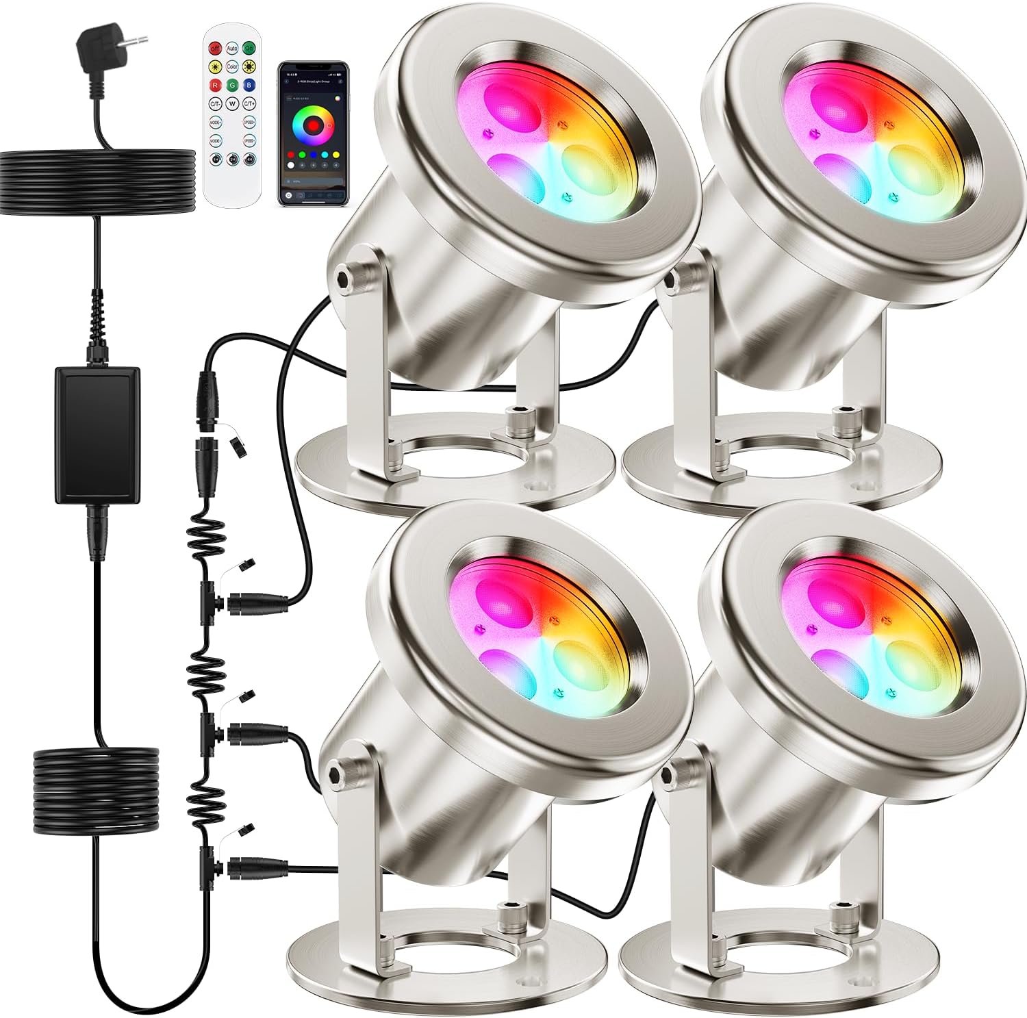 All-in-One Teichbeleuchtung LED Edelstahl SS316, RGB Erweiterbare Teichlampen Unterwasser mit 12M Kabel, Teichlicht IP68 für Teich, Wasserfall, Bach, Fischteich, Wasserspiel, 4er-Pack