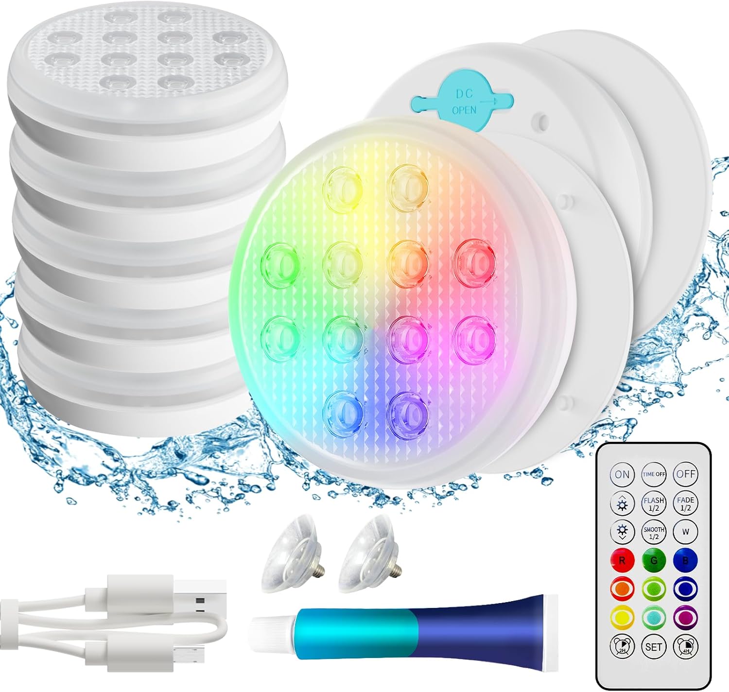 idyl light Wiederaufladbare Unterwasser-Pool-Lichter mit Fernbedienung, wasserdichtes Unterwasser-Ladegerät, batteriebetrieben, gesteuert, 16 farbwechselnde LED mit Magnet