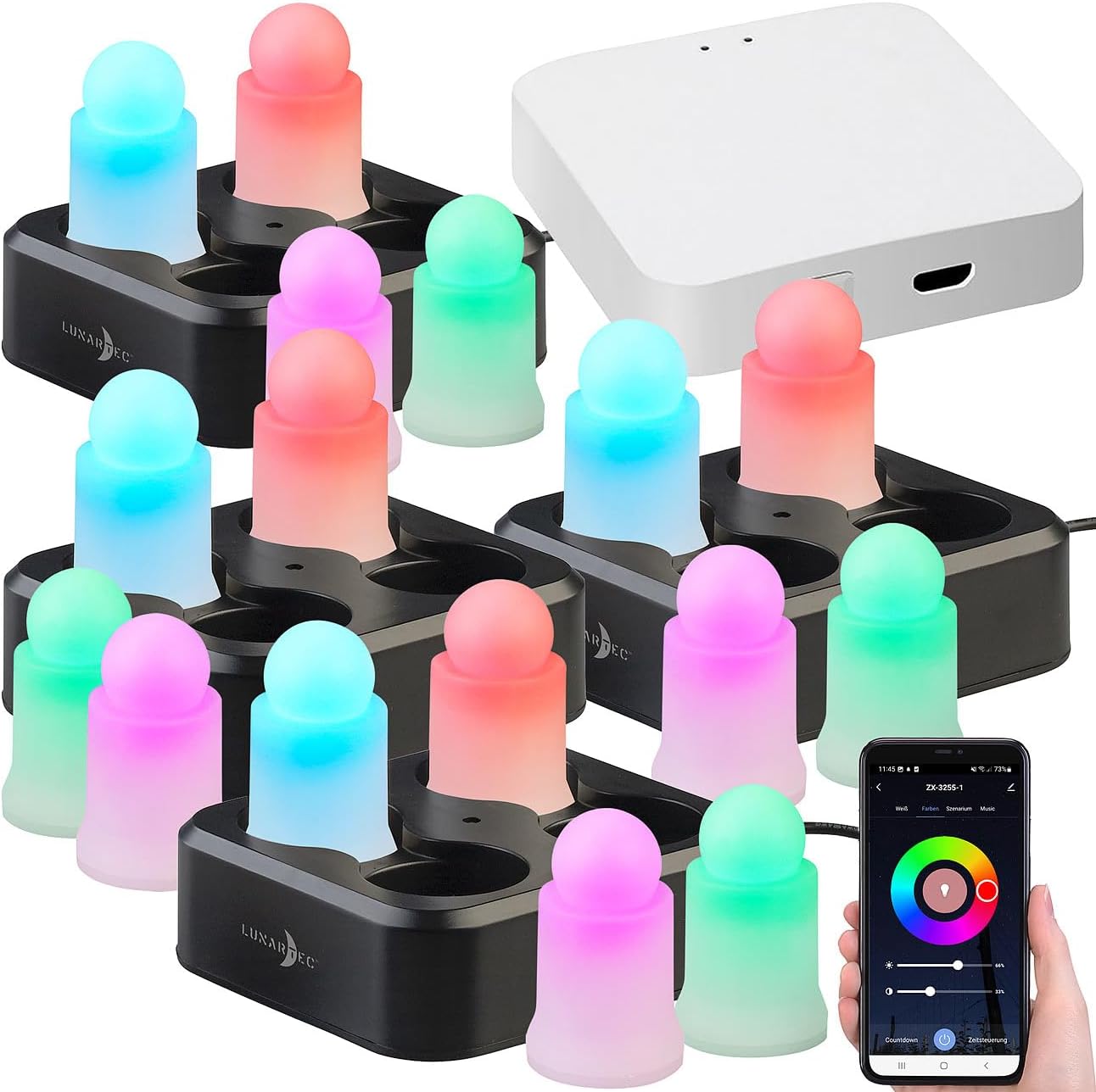Lunartec LED-Kerzenlampe: 16er-Set wetterfeste LED-RGBWW-Kerzen mit Akku, Ladeschale, Gateway (Partylichter, WLAN-Kerzen, Home)