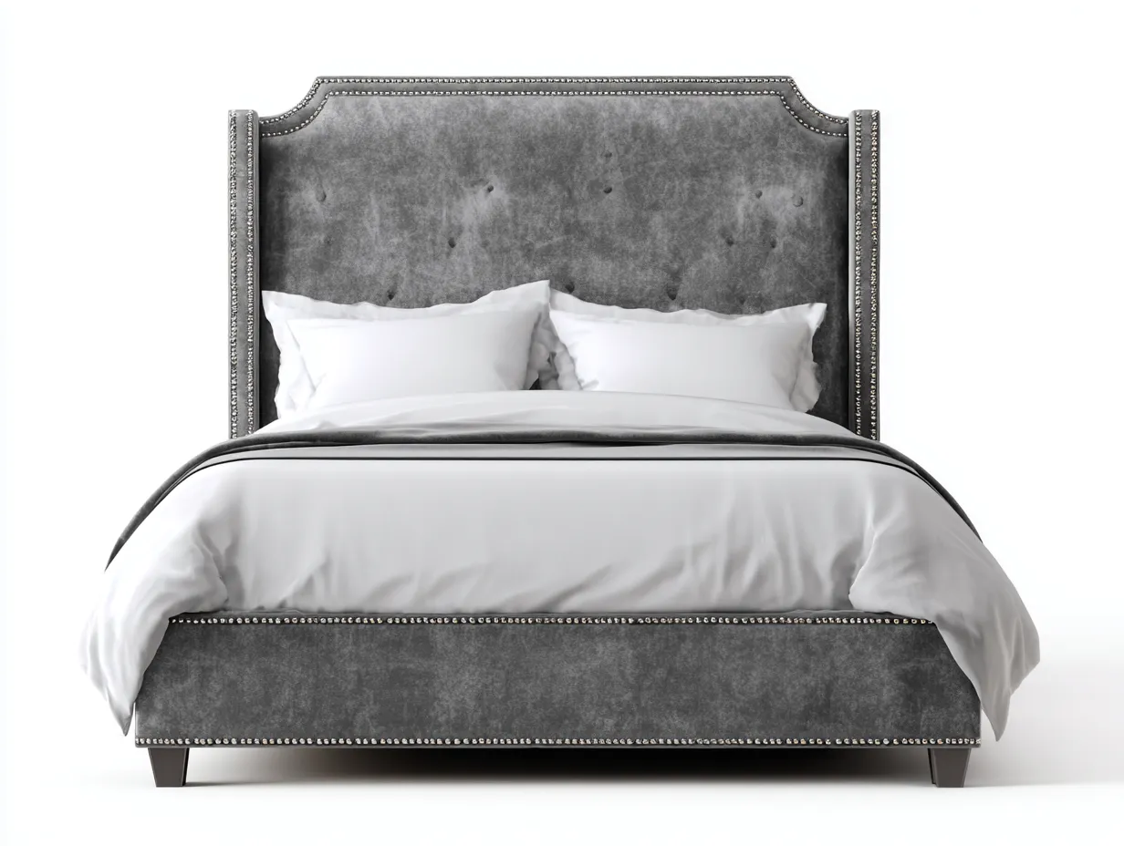 Der Bezug aus Samtstoff in Grau verleiht dem Bett eine weiche Haptik und eine elegante Oberflächenwirkung. Die tragende Konstruktion aus Holz sorgt für Stabilität und eine zuverlässige Nutzung. Die Verarbeitung ist präzise ausgeführt und unterstützt eine gleichmäßige Polsterung.