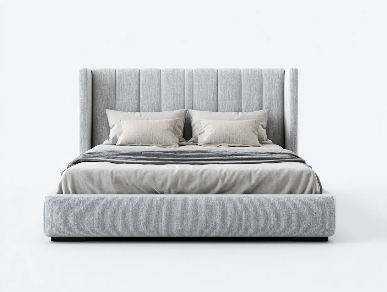 Das hohe, vertikal strukturierte Kopfteil bietet eine komfortable Rückenlehne zum Lesen oder Entspannen. Die umlaufende Polsterung sorgt für ein ruhiges Gesamtbild und erhöht den Nutzungskomfort.