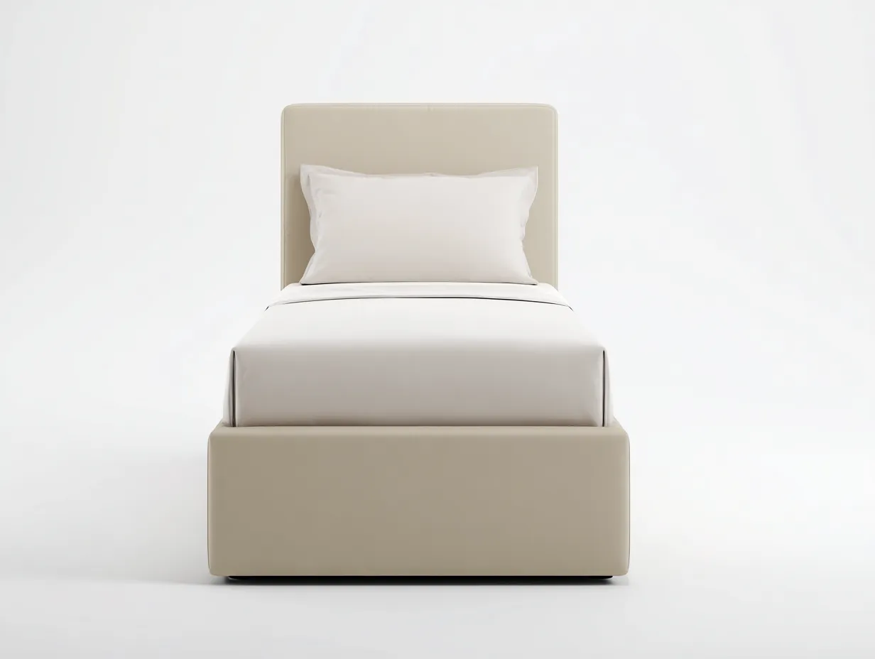 Dieses Einzelbett präsentiert sich mit einer klaren, reduzierten Formensprache und einer ruhigen, modernen Ausstrahlung. Das kompakte Design eignet sich ideal für Schlafzimmer, Gästezimmer oder Jugendzimmer und fügt sich harmonisch in zeitgemäße Wohnkonzepte ein.