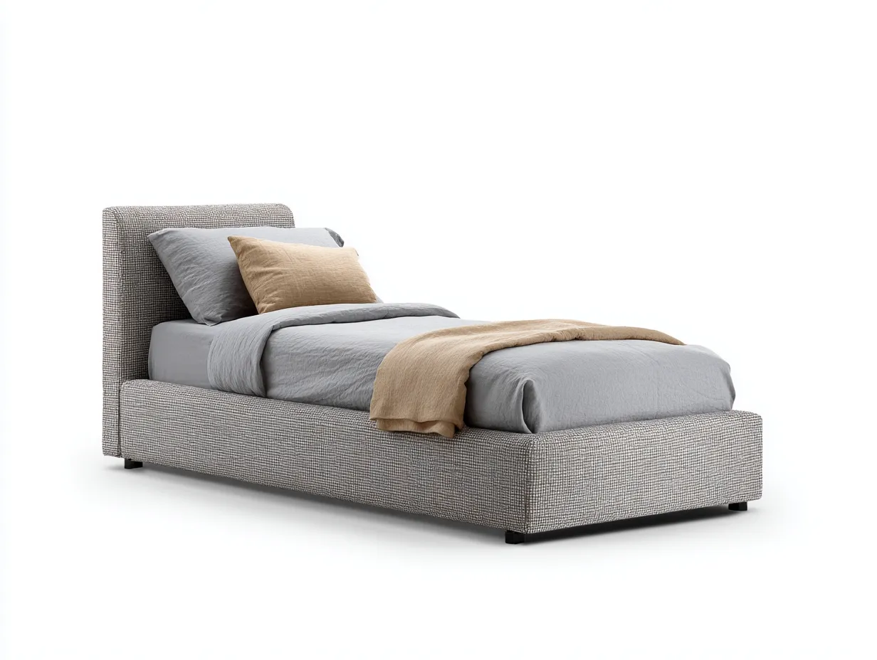 Dieses Einzelbett kombiniert eine klare, moderne Linienführung mit einer ruhigen, wohnlichen Ausstrahlung. Die ausgewogenen Proportionen und der vollständig gepolsterte Rahmen machen es zu einer komfortablen Schlaflösung für Schlafzimmer, Gästezimmer oder Jugendzimmer.