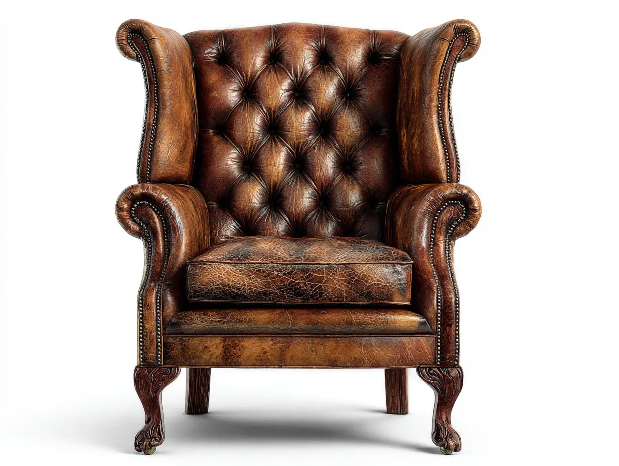 Die hohe Rückenlehne bietet zuverlässige Unterstützung für Rücken und Schultern. Die ausgeprägten Armlehnen fördern eine entspannte Sitzhaltung, während die klassische Knopfheftung dem Sessel seinen zeitlosen Vintage-Charakter verleiht.